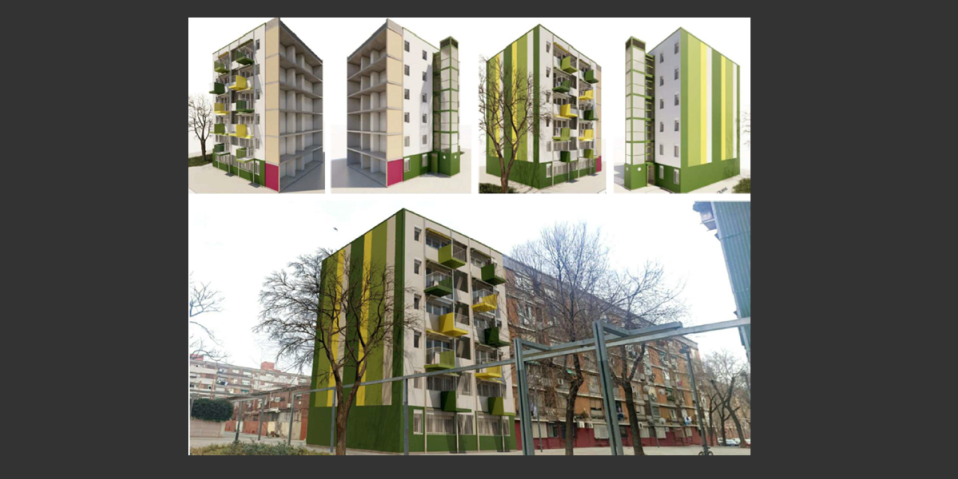 Este estudio consistió, por un lado, en la rehabilitación energética con la modificación de la cubierta, aislamientos y rehabilitaciones en fachadas y patios, reforma interior de todas las viviendas, sótano y espacios comunes, y por otro lado, en la instalación de un ascensor externo ocupando una parte de la calle.